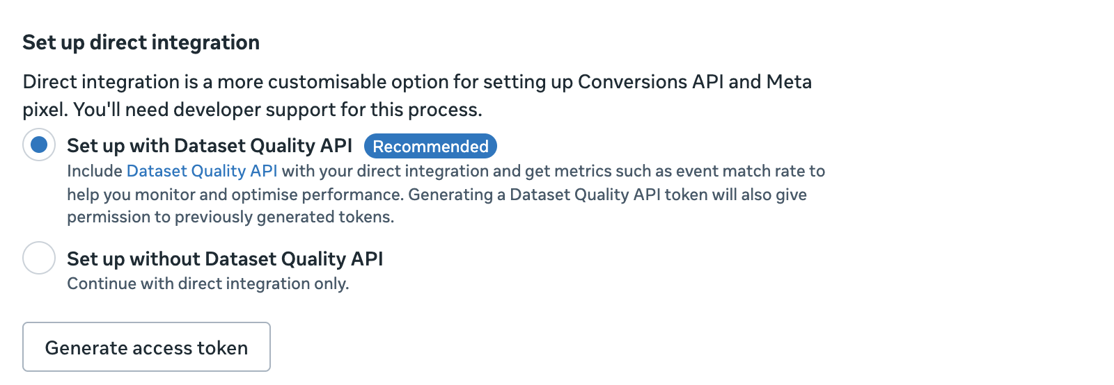 Select your new dataset, then select Settings, find the Conversions API section and click on “Generate access token” under “Set up manually”. Copy this Access Token for use in the next step.