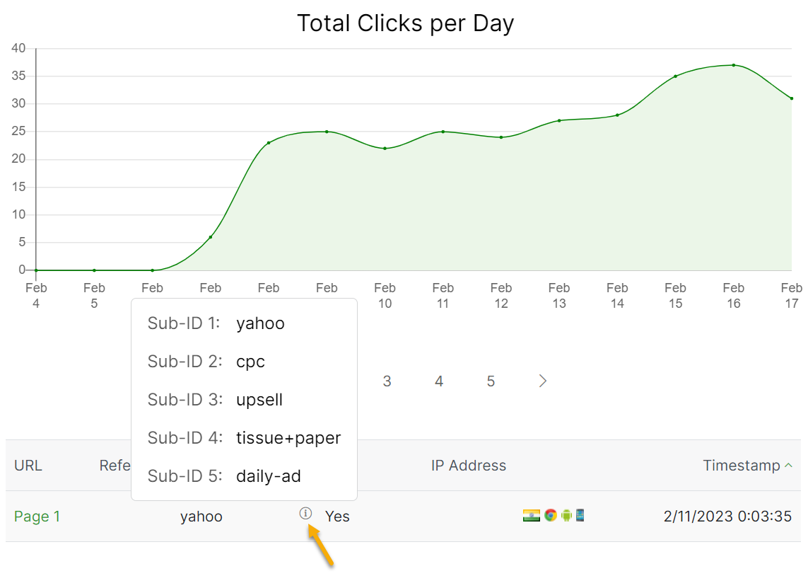 Finally, when viewing your Sub-ID stats by clicking on the number in the “TC” or “UC” column, remember that only the first Sub-ID will show up due to space constraints and the fact that most users generally only use one Sub-ID with rotators. You can see any additional Sub-IDs by hovering over the symbol.